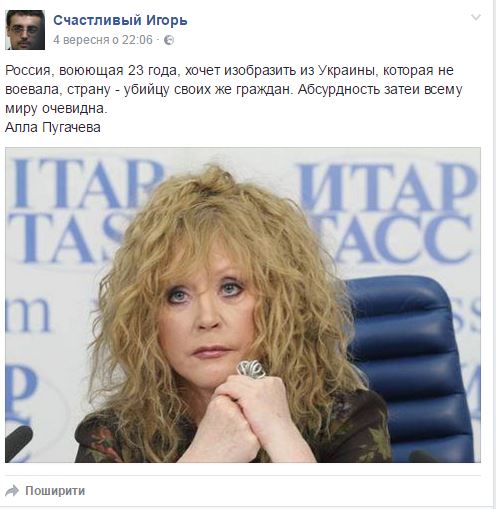 “Росія, воююча 23 роки, хоче зобразити з України, яка не воювала, країну – вбивцю своїх же громадян. Абсурдність затії всьому світу очевидна “, – Алла Пугачова.