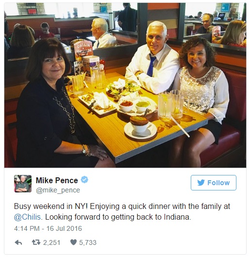 Американський політик Майк Пенс (Mike Pence) опублікував в Twitter фотографію, на якій він вечеряє з сім’єю в одному з ресторанів Нью-Йорка. Користувачі соцмережі помітили на знімку незвичайну деталь: