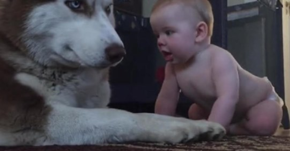 Цікавий випадок стався у сім’ї, в якій нещодавно народився малюк. Господарі переживали, як собака буде ставитися до нового члена сім’ї. Звичайно, таке поповнення стало шоком для собаки. Дитинка проявляє великий інтерес, смикає його шерсть і всіляко відвертає увагу. Спочатку суворий хаскі поводився насторожено, але так і не встояв перед ніжністю та чарівністю малюка.