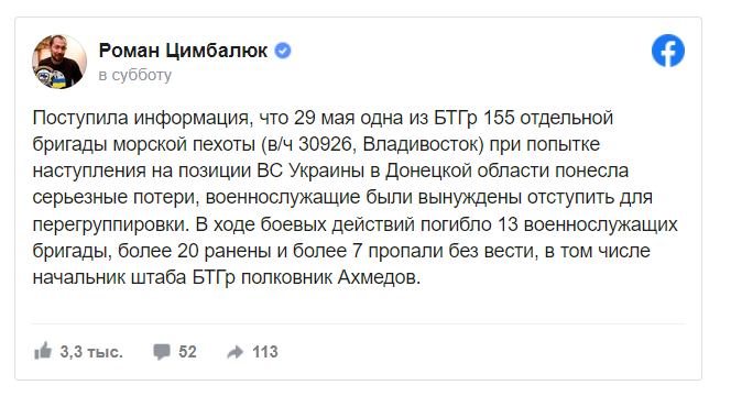 29 травня одна з БТГр 155 окремої бригади морської піхоти (в/ч 30926, Владивосток) при спробі наступу на позиції ЗС України на Донеччині зазнала серйозних втрат, військовослужбовці були змушені відступити для перегрупування. Про це повідомляє журналіст Роман Цимбалюк.